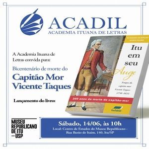 LANÇAMENTO DO LIVRO “ITU EM SEU AUGE: TEMPOS DO CAPITÃO-MOR VICENTE TAQUES (1749-1825)”, DE AUTORIA DO ACADÊMICO SYNESIO SAMPAIO GOES FILHO