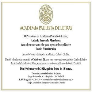 A Academia Paulista de Letras realiza no próximo dia 19 de março de 2026, às 18h, a cerimônia de posse do escritor Daniel Munduruku na Cadeira 21 da instituição.